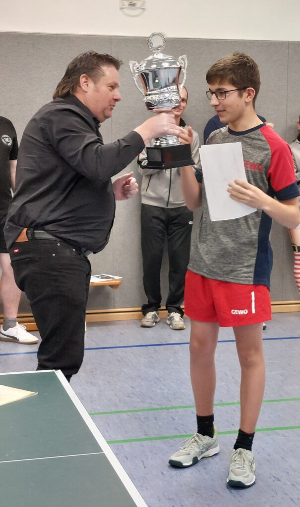 Im Halbfinale setzte sich Nino, wie immer kampf- und willensstark, gegen Jonne mit 3:0 durch. In der zweiten Partie von Lars gegen Lando ging es da wesentlich enger zu. Erst im fünften Satz setzte sich Lando gegen seinen Trainer durch, der ihm nach dem Spiel anerkennend gratulierte.