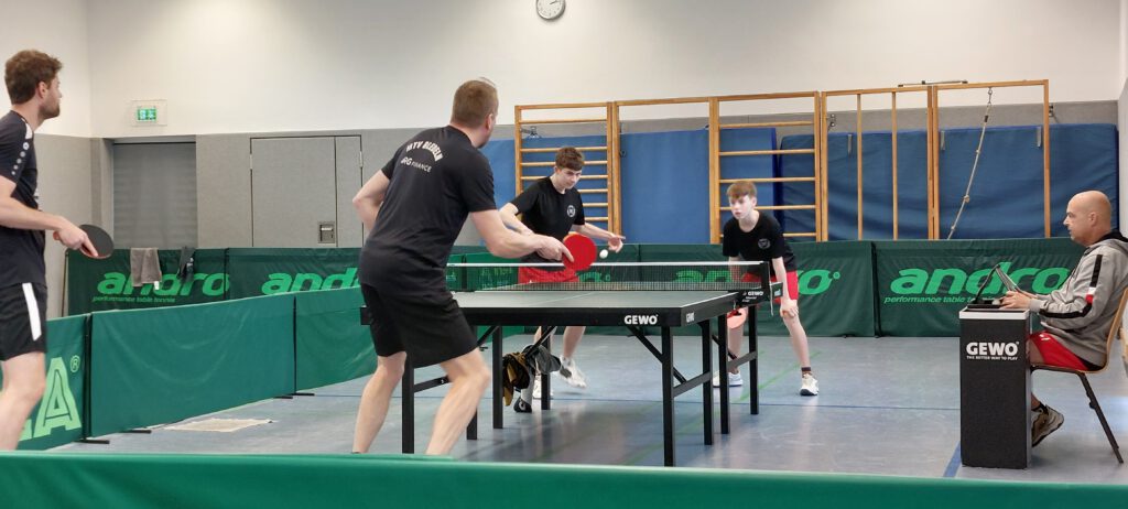 Sowohl die beiden Doppel von Jonah/Marcel gegen Helge Hartmann/Christian Berner und auch Niklas/Moje gegen Timo Prause/Andre Förster als auch die Einzel von Jonah gegen Timo und Niklas gegen Helge gingen relativ ungefährdet an unser Team. Stephan Wiecha, der als Nummer 1 der 2. Mannschaft erstmals in der Rückserie für die Einzel eingesetzt wurde, hatte jedoch Probleme gegen Andre, der gut mit seinem Noppenbelag zurechtkam. Im 3. Satz klappte es zwar besser, dieser ging dann aber knapp mit 10:12 weg. Moje, Niklas undMoje erhöhten danach sicher auf 7:1. Stephan musste dann leider auch gegen Christian einen weiteren Punkt abgeben. Moje setzte anschließend gegen Andre den Schlusspunkt zum 8:2 – Sieg. –> siehe Spielbericht